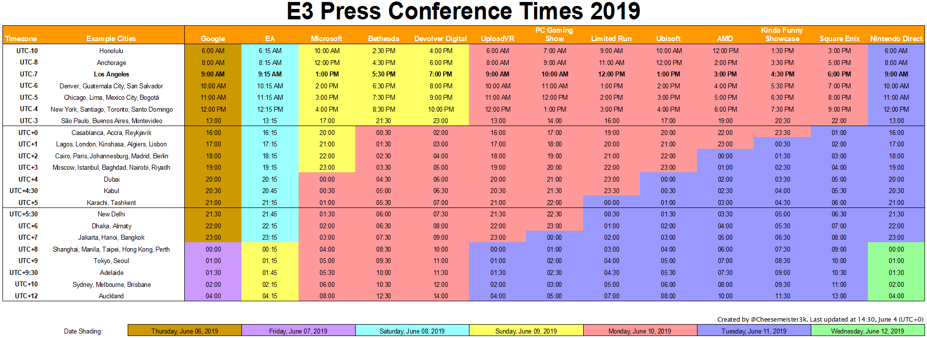 Below is the comprehensive e3 2021 broadcast schedule. E3 2019 press conference schedule. See the e3 schedule for ubisoft, microsoft, nintendo and more. E3 has now concluded, but you can catch up on all fantastic news, trailers, and live gameplay demos that aired on gamespot's e3 live stage show by heading to our schedule. How to watch e3 2021: